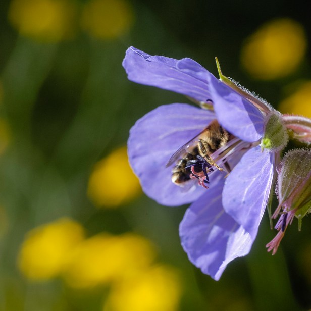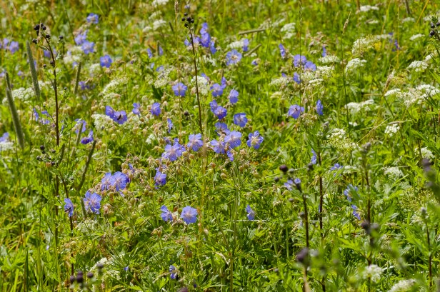De beemdooievaarsbek, Geranium pratense komt voor in uiterwaarden en bloemrijke hooilanden en bloeit van mei tot juli met helderblauwe grote bloemen. Deze zeldzame vaste plant wordt ook veel in allerlei variaties en kruisingen gekweekt als tuinplant. Er komen enorm veel insecten op af. Wordt ca 60 cm hoog en groeit graag in de volle zon.
