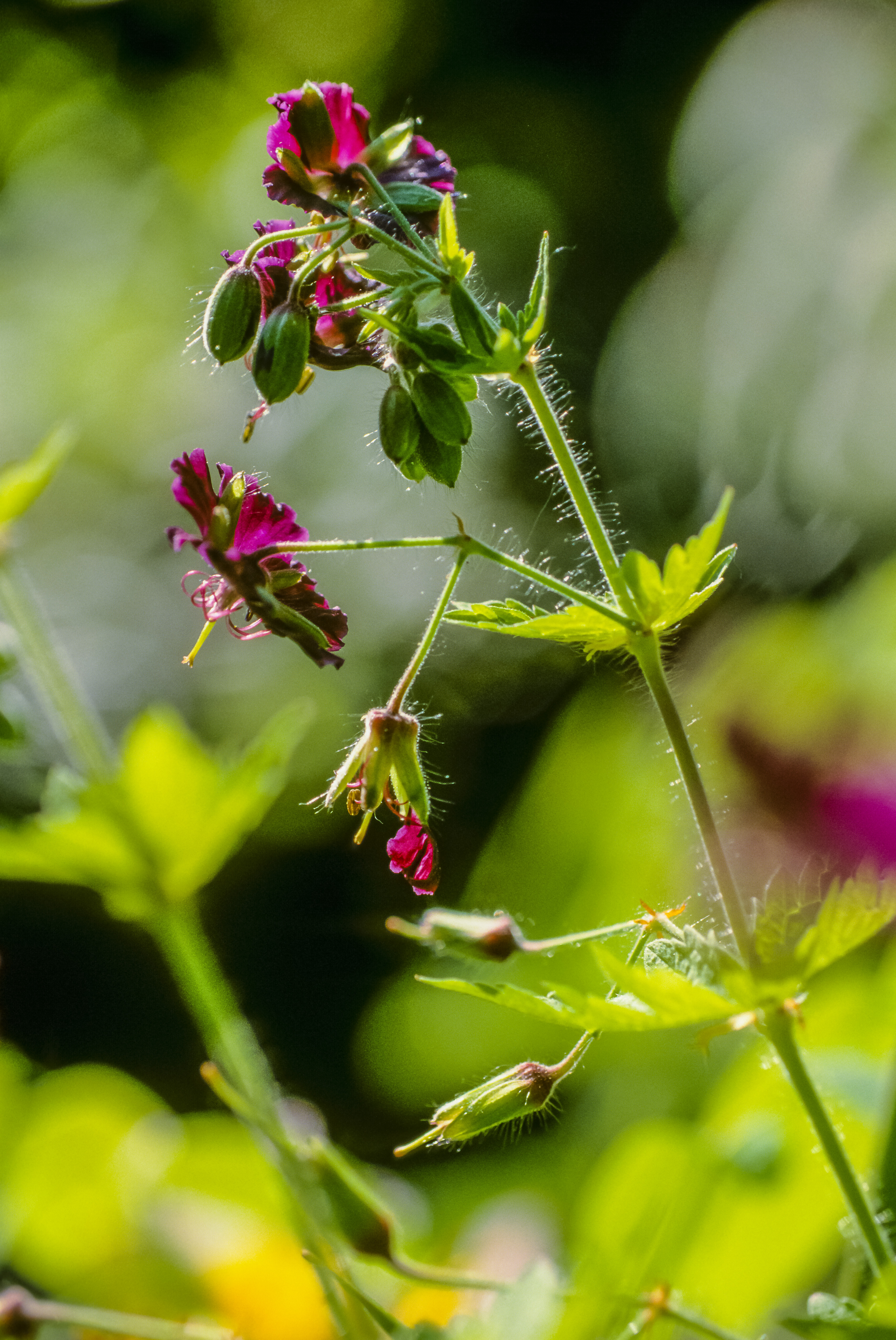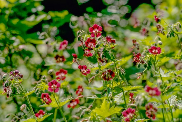 De donkere ooievaarsbek, Geranium phaeum is een wat zuidelijke soort die al heel lang als tuinplant gebruikt wordt. Ze werden al eeuwen geleden geplant rond de Friese Stinzen. Ze kunnen goed tegen schaduw en bloeien vanaf april maanden door. En vaak nog een keer in de herfst. De bloemen zijn niet altijd diep zwartpaars maar maar hebben ook vaak lichtere kleuren tot zelfs wit. het is een vaste plant en wordt ca 40 cm hoog. Heel veel insecten waaronder wilde bijen bezoeken de bloemen