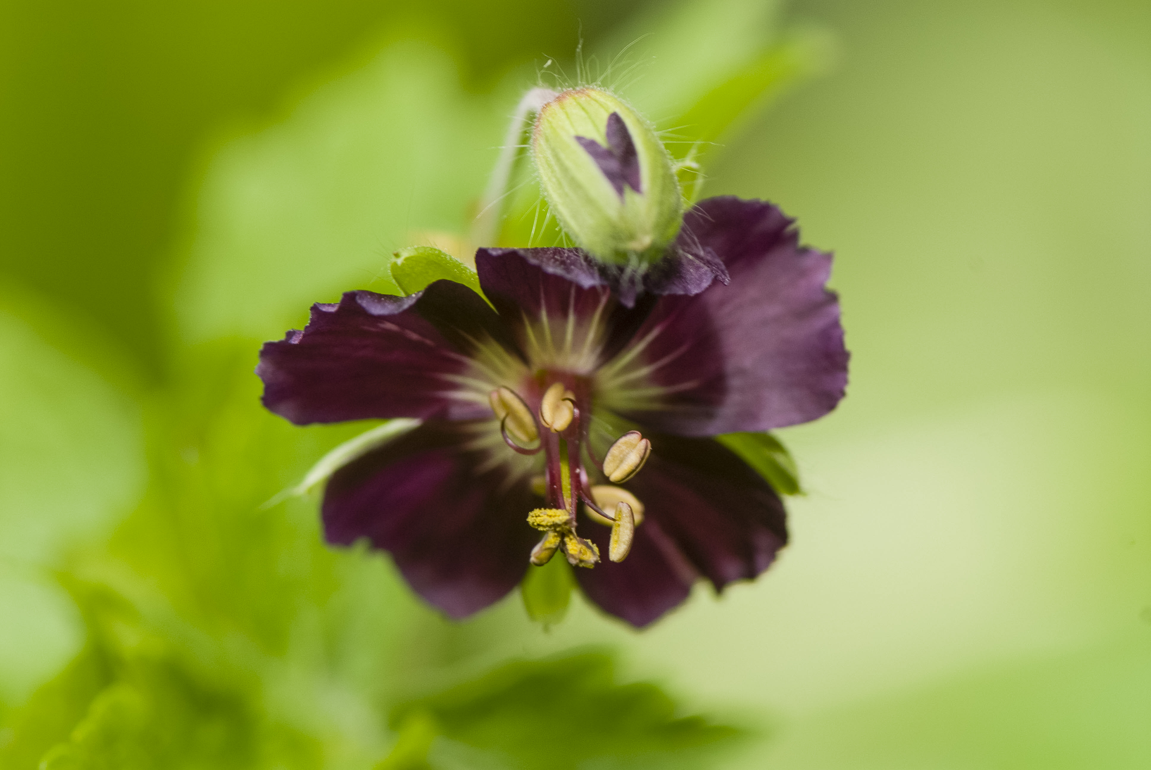 De donkere ooievaarsbek, Geranium phaeum is een wat zuidelijke soort die al heel lang als tuinplant gebruikt wordt. Ze werden al eeuwen geleden geplant rond de Friese Stinzen. Ze kunnen goed tegen schaduw en bloeien vanaf april maanden door. En vaak nog een keer in de herfst. De bloemen zijn niet altijd diep zwartpaars maar maar hebben ook vaak lichtere kleuren tot zelfs wit. het is een vaste plant en wordt ca 40 cm hoog. Heel veel insecten waaronder wilde bijen bezoeken de bloemen