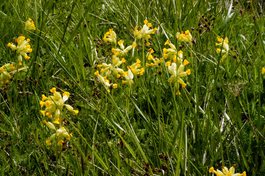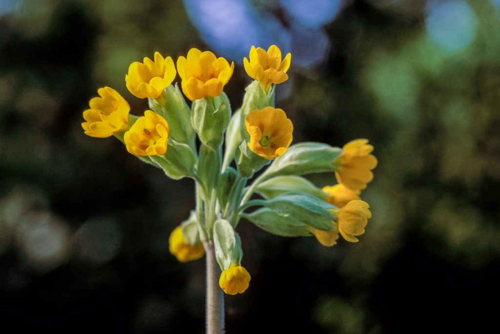 Gulden sleutelbloem, primula veris bloeit meestal in april in wegbermen, kalkhellingen en dijken maar is uiterst zeldzaam en bedreigd. Er zijn veel cultivars en ze kruist ook met de slanke sleutelbloem. In de tuin groeien ze prima op een zonnige plek die niet speciaal kalkrijk hoeft te zijn, maar in te zure grond leven ze kort. Hij wordt ca 25 cm hoog en bloeit maart-april. Het zaad kiemt als het heel vers is of pas na een vorstperiode.
