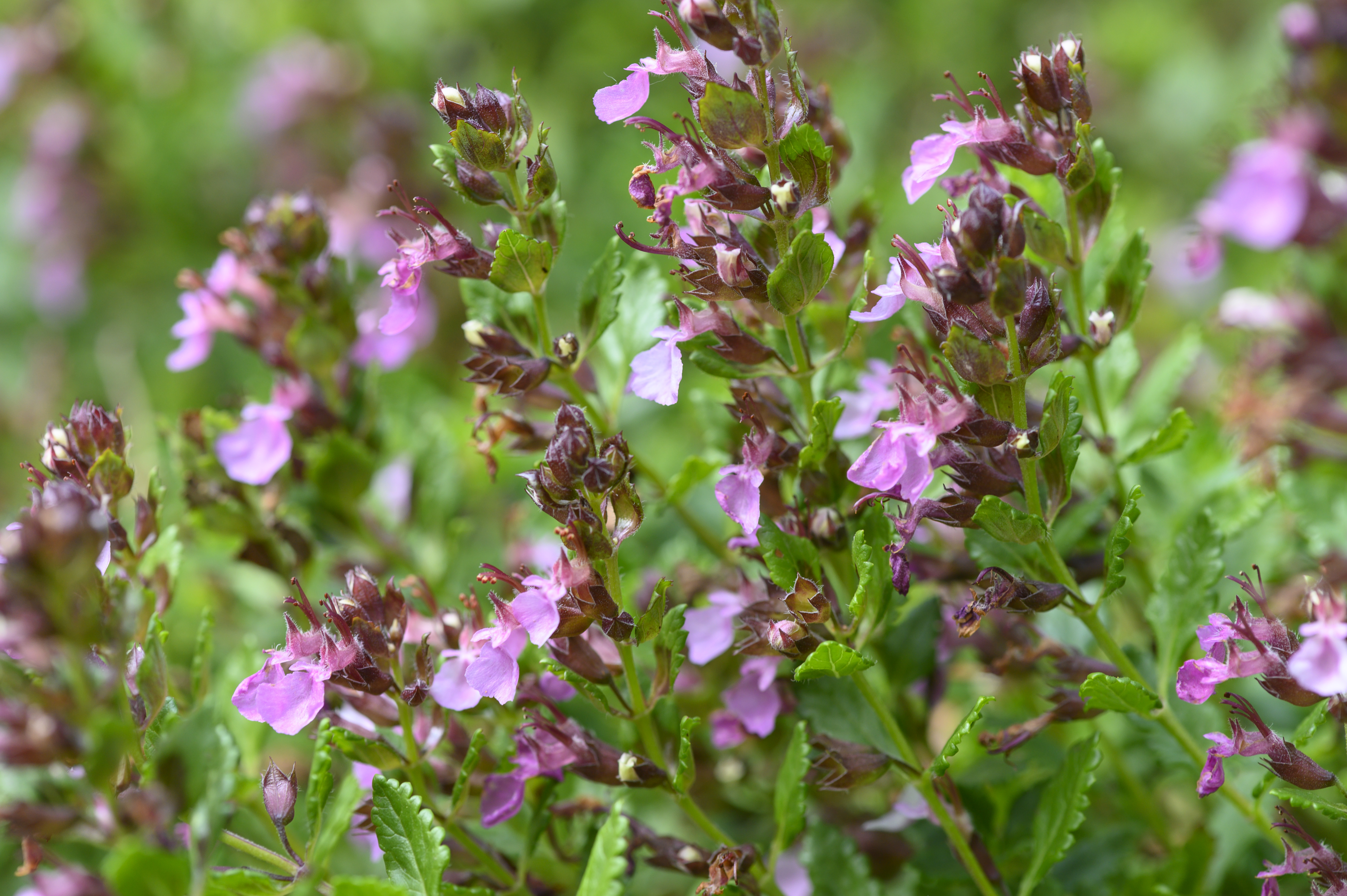 Het is familie van de gamanders. Teucrium. De meeste soorten zijn vrij tot zeer zeldzaam voor ons gebied maar valse salie niet. Die staat op wat zure zanderige grond aan de rand van heides en schrale bossen. Hij doet het dus ook goed in de halfschaduw, kan veel droogte verdragen en is dus ideaal voor de wilde tuin. Hij wordt wat bossig, tot wel 60 cm of hoger op den duur, bloeit vanaf juni en er komen heel wat insecten op af.