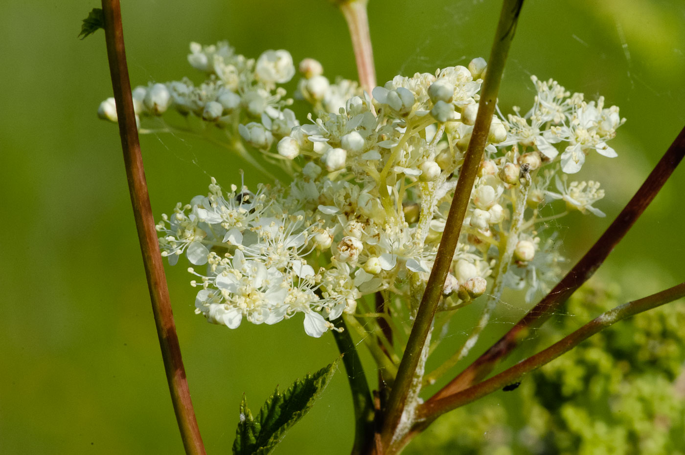 Moerasspirea, Filipendula ulmaria is een grote plant die het vooral goed doet aan slootkanten en in niet te droge greppels, in onze veengebieden en eigenlijk overal wel waar water en niet te voedselarme grond een combinatie zijn. Hij kan wel 150 cm hoog worden en bloeit in de zomer tot in de herfst, vooral als hij een keer gemaaid wordt. (Meer maaien, meer bloemen in dit geval!) Trekt vlinders bijen en tal van andere insecten aan op de bloemen maar ook als waardplant. De bloemen zijn bijzonder geurig ook na drogen en het was ooit de bron van salicylzuur, de pijnstiller van het asperientje. Nu wordt die stof en zijn opgevolgers synthetisch gemaakt.