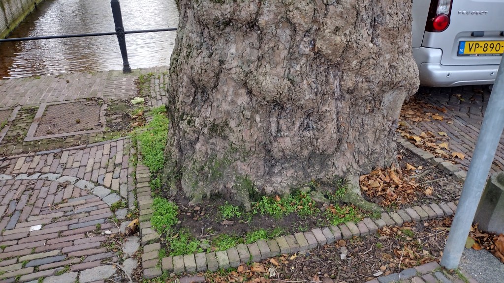 De plek is namelijk vergeven van de wortels van de boom, zeker als hij wat ouder is.Logisch. Voor de stevigheid is de plek rond de stam voorzien van sterke armen, De hoofdwortels. Die houden hem overeind en verspreiden zich zo ver mogelijk om toch maar ergens iets van water en voedsel te vinden. Veel bomen willen ook de diepte in, maar dan ken je de ondergrond in de straat nog niet… Daar is weinig te halen meestal maar ligt wel van alles waar steeds naar gegraven moet worden waardoor de diepere wortels naar hartelust verwijderd worden. En ook de horizontale wortels trouwens. Nu is de onderkant van de verharding wel een bron van vocht. Klinkt raar maar de verharding is kouder dan de ondergrond en daardoor condenseert op micronieveau het vocht aan de onderkant en na verloop van jaren hebben de bomen ook veel wortels naar die verharding gestuurd.