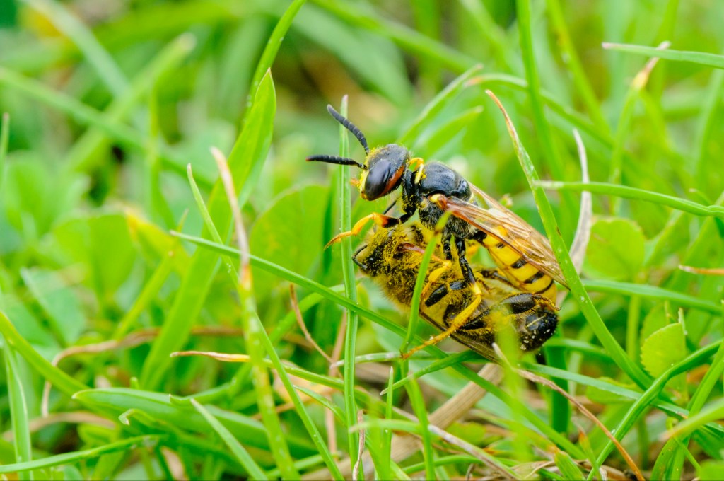 Deze bijenwolf, een graafwesp, doet het anders. Die vangt een (honing)bij, verdooft haar, knijpt er de verzamelde nectar uit als voedsel, en brengt de verdoofde bij in het voorgegraven hol in een kamertje met andere gevangen bijen en legt er eitjes bij. De larven eten dan de nog levende bijen op, verpoppen en komen later uit. Een nest kan meters diep zijn en verschillende kamers bevatten.