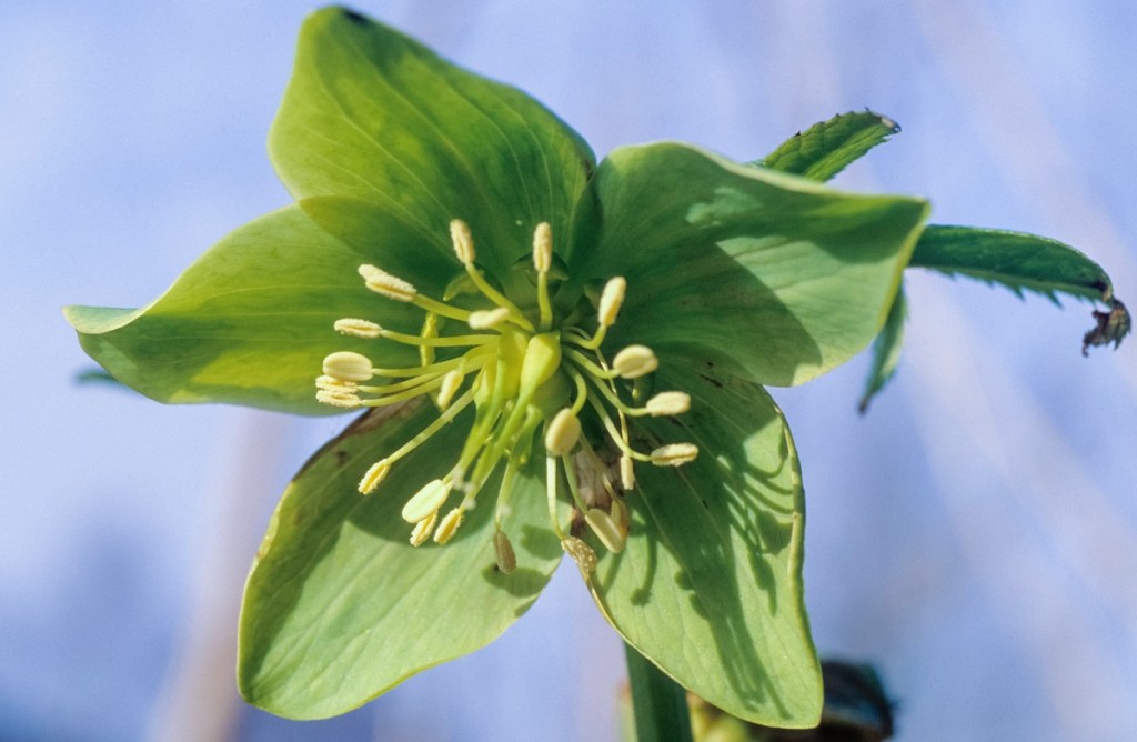 Bijvoorbeeld stinkend nieskruid, Helleborus foetidus. Het is een Midden Europese soort die tot in België voorkomt en ook in Zuid Limburg. De meningen zijn wat verdeeld maar zeker is dat de deze soort al heel lang voorkomt in onze buurt. Stinkend nieskruid staat in rijke bossen die meestal redelijk kalkrijk, in ieder geval niet zuur zijn. De bloeitijd is van eind december tot in april. Vroeg vliegende bijen (vaak hommels) komen op de bloemen af. Het heeft trossen met groene bloemen met een rozepaars randje.
