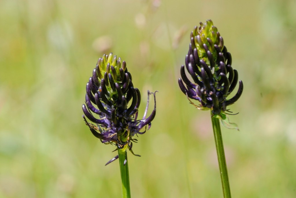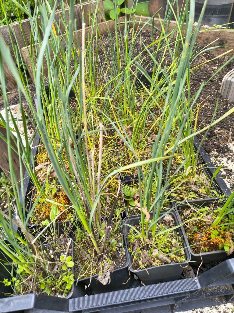 Wat nog bijzonderder is dat, omdat we geen bestrijding van enige aard toepassen, ook veel bijgroei in de potjes. Dat geeft bijzondere vondsten. Sommige soorten blijken zich opeens enorm uit te zaaien in de buurpotten. De algemene aanwaaiers zoals bastaardwederikken in soorten, geraniums in soorten, ereprijsjes, grassen, mossen… Maar ook wat minder algemene soorten zoals wilde hemelsleutel, viooltjes, primula’s, echte koekoeksbloem, brunel tot toch wel heel zeldzame zoals gevlekte rietorchis, graslathyrus en knolsteenbreek…
