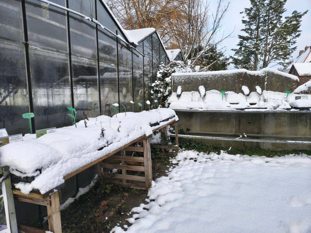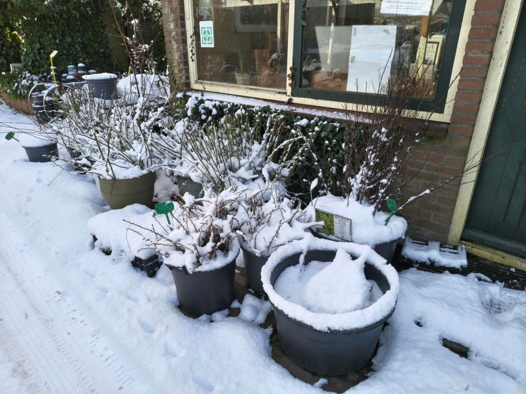 De planten in potten zitten onder een sneeuwlaagje of staan in de kas of tunnelkas en zijn in volle rust over het algemeen.