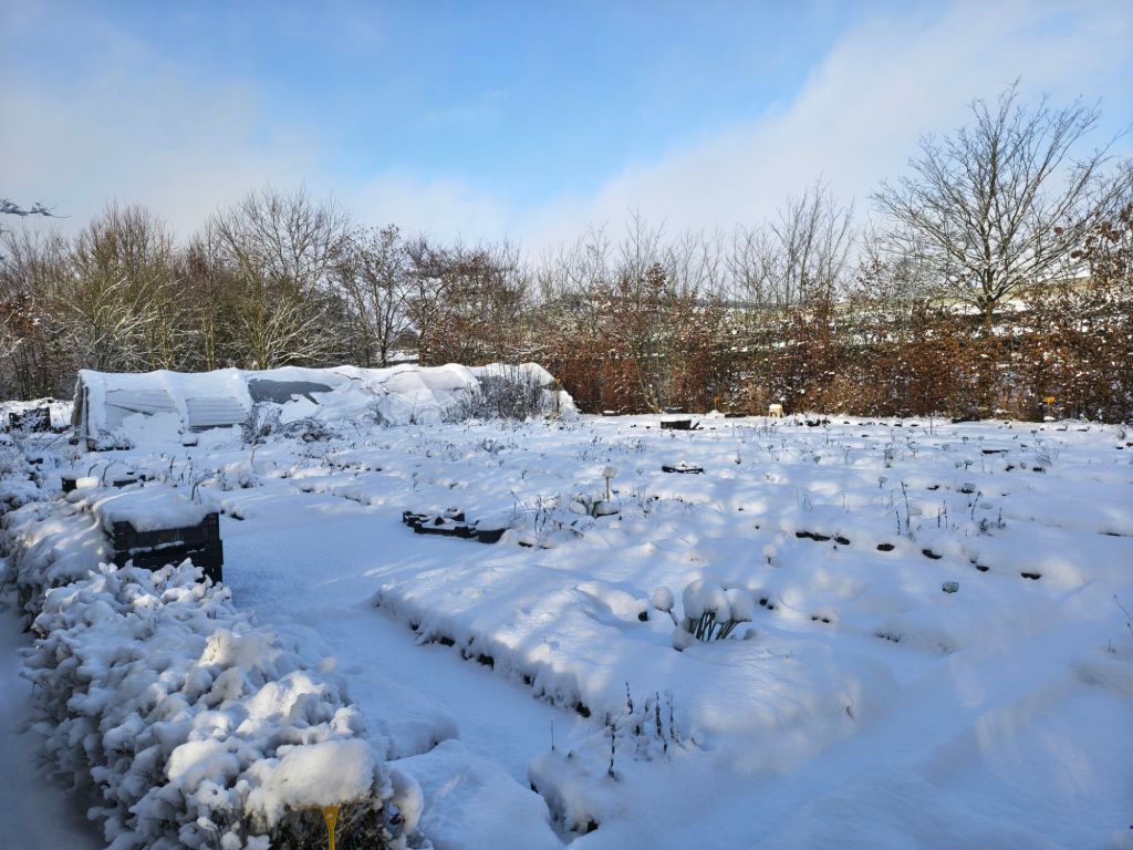 4 januari 2026. Kwekerij Flora voor Fauna bij KasenCo in Koetenhoef is in diepe rust. We zijn er soms wel voor wat klussen maar tijdens vorst en sneeuw ligt alles stil verder. Ook de verkoop van wortelgoed wat typisch een winterproduct is, stopt nu omdat we de struiken en boompjes niet meer uit de kuipen kunnen halen (ze staan buiten) en je kunt ze ook niet planten.